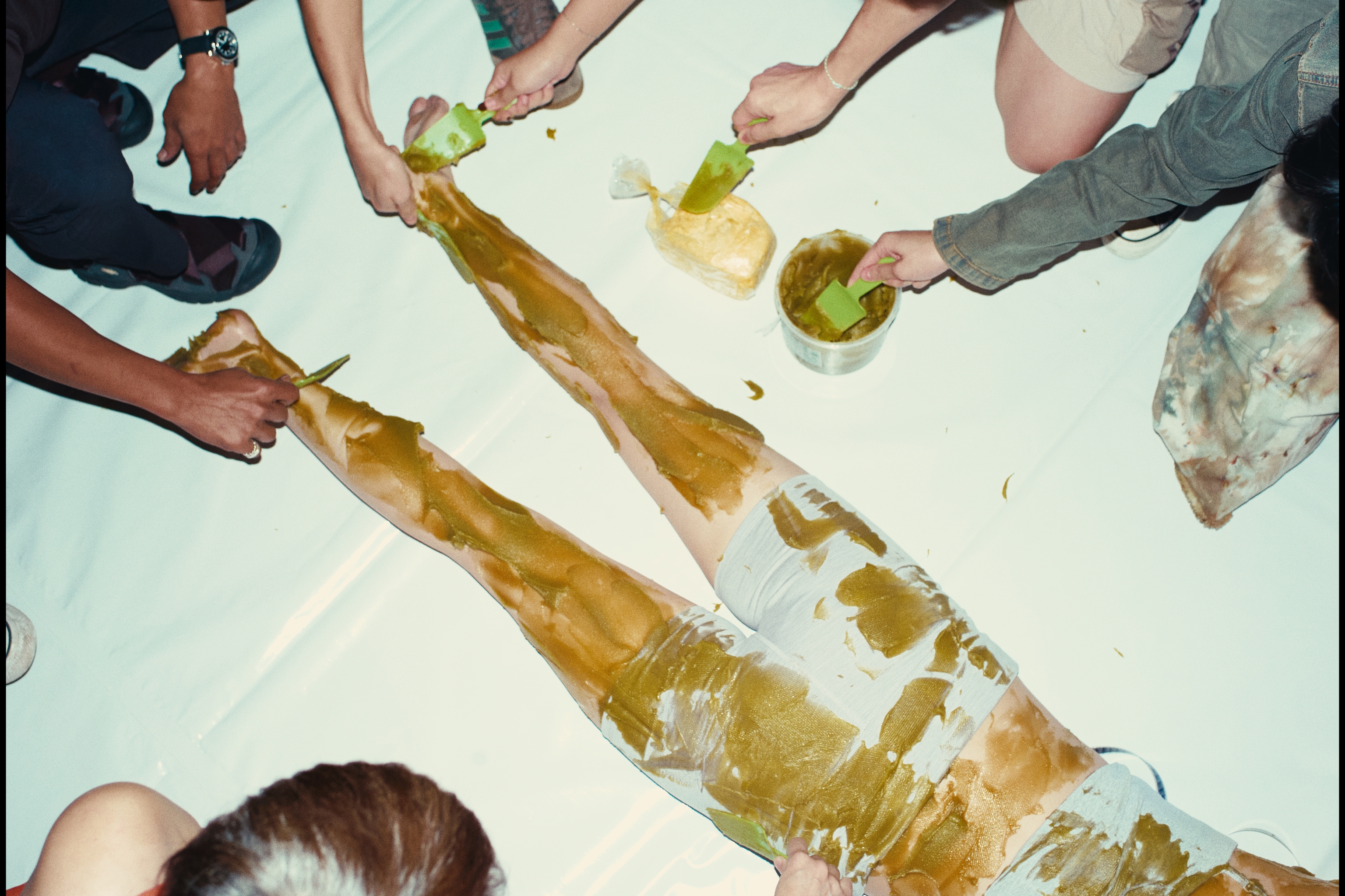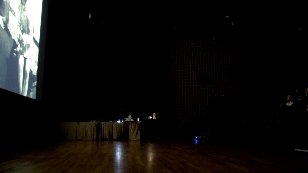 The performance closed with the audience spreading kaya over the body of one of the performers, followed by a physical sandwiching of the two artists in underwear; with the performed films, a block of butter, and the slathered kaya between them.