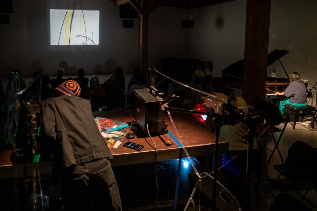 A pulling at hairs and roots and an exploration of discipline and the body, thinking on being and madness as an expression of resistance against sanity, discipline and control. Envisioning a visual and sonic ‘pulling’ and ‘straining’, the work hopes to create a seeing together through texturality. The performance comprises 16mm leader with hair strands that are modified live, in dialogue with improvised piano, woodwinds and electronics played to percussive elements hung from a 16mm film projection loop.
