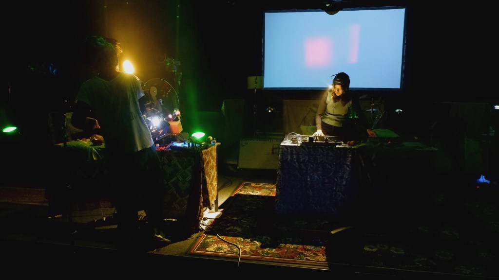 Live interventions like burns, knife scratches and modifications with organic and botanical materials such as kaya, pandan leaves, bread and eggs, were used on three 16mm projectors. The film loops were prepared in various experimental processes: broken down by moldy kaya, soaked in coconut milk and pandan paste, and some printed through DIY transfers – an invitation to chaos and chance over time. This was accompanied by an electronic high-BPM soundscape with the projector’s modified motor sending speed-to-note signals to a virtual synthesizer rack.