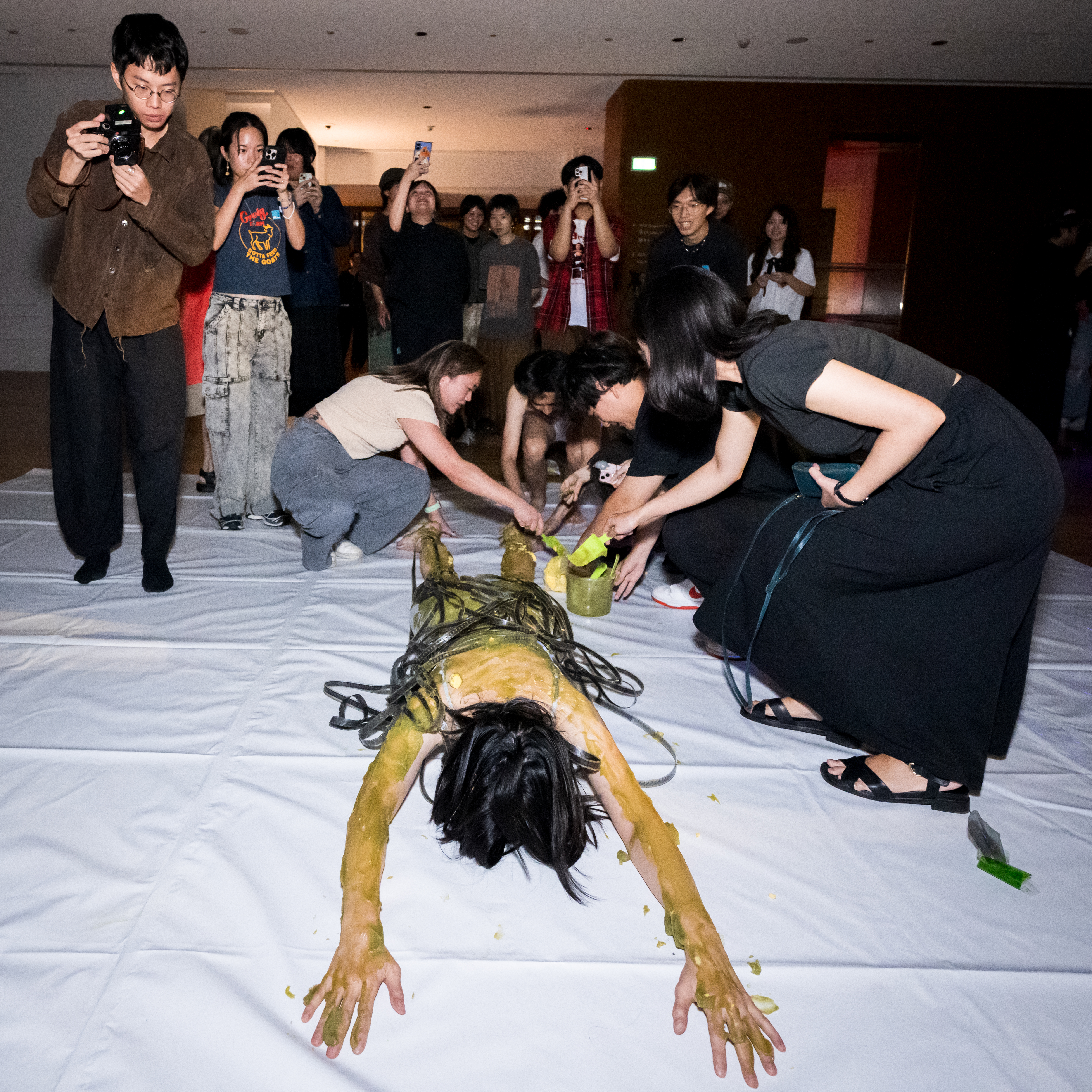 The performance is inspired by the historical and spiritual traces of the taro as an ancient crop in early Southeast Asian history. A thinking on its connections to maritime Southeast Asia, the borderlessness of the region, the islands and rivers, as well as migratory and agricultural flow. In bringing forth intimately textural impressions of the taro, the performance seeks to cast our eyes to buried layers beneath our soil. A physical reanimation of the clashing and converging lines of flow, in place, identity and history.